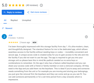 ” I’ve been thoroughly impressed with this storage facility from day 1. It’s ultra-modern, clean, and thoughtfully designed. The standout feature for me is the dedicated app, which allows seamless access to the facility without needing keys or codes — incredibly convenient and secure app. A unique acces code is created soley for you to gain access to the site and into the facility if you did not want to use the app. The app is required to get you into your storage unit so please bare this in mind.No padlock needed so no extra keys or combinations to remember. On the app it also has a feature called keyshare and you can share your access code with a friend or family member or even a removal company. All they need is the App and you add them via the keyshare. This is ideal if you’re away and someone needs something from the unit or for example you are moving and storing your belongings, you just give the removal firm the keyshare and they can come and go as you see fit. You can add someone permanently or for a set time period from a day onwards which is impressive.